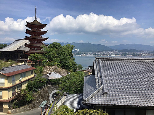実際に近くで見るとその大きさに圧倒されます。この後ろの壁を含めた内外装の一部に弊社の製品を使っていただきました。宮島を象徴するような和風な仕上がりになっていて、うれしい限りです。