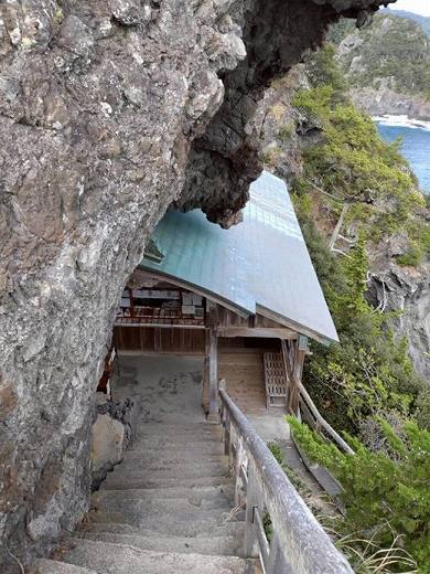 そこからさらに崖の先端へ進むと、断崖絶壁にめり込むように建てられた「石室神社」が現れます。