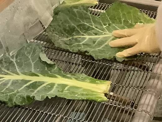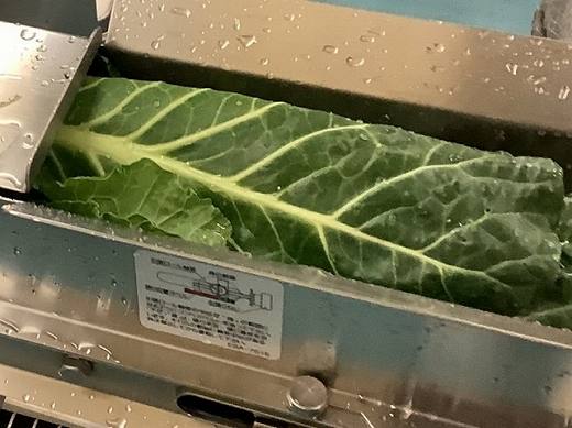 収穫したケールの葉を1枚1枚チェックし、高圧水流で丁寧に洗浄します。
