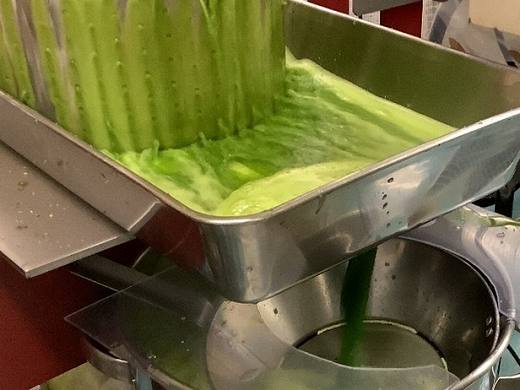 ペースト状にしたケールを搾汁機にかけ青汁を搾ります。